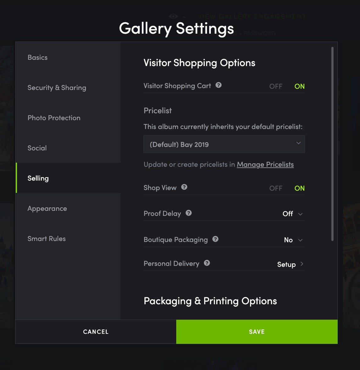 Simply select your pricelist at your desired level. Remember, at the Gallery level, you can set a pricelist via the Gallery settings as well as through the pricelist itself.